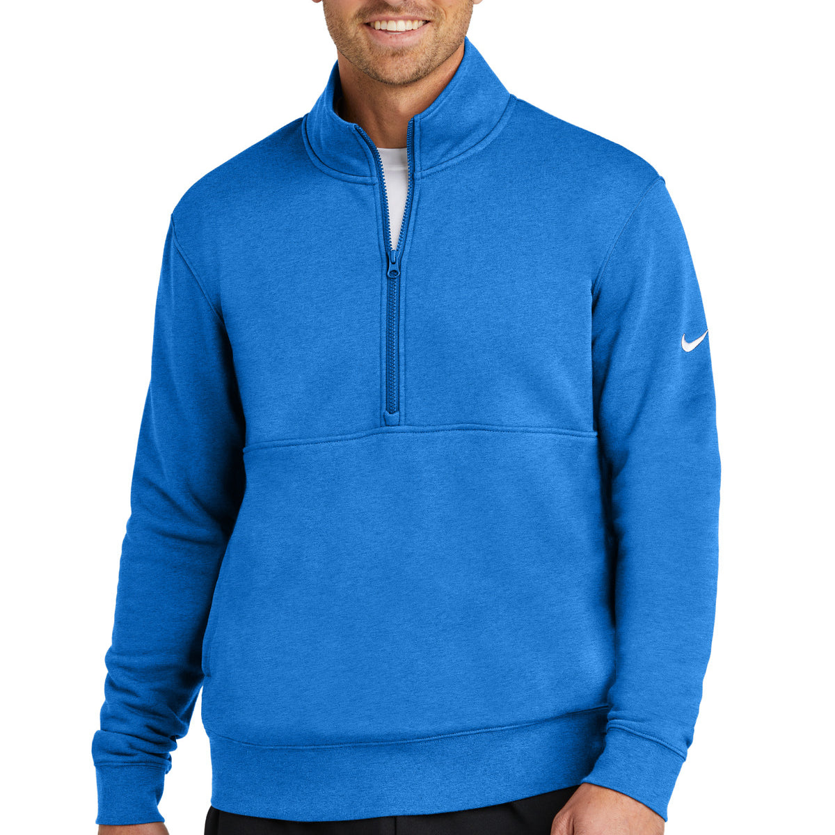 Built with versatility in mind, this brushed-back 1/2-zip has an elevated look which makes it perfect for work or play. Design details include a zip-through collar with dyed-to-match zipper. Side pockets. Rib knit cuffs and hem. A contrast Swoosh logo is embroidered on left sleeve. Made of 8.3-ounce, 80/20 cotton/polyester.