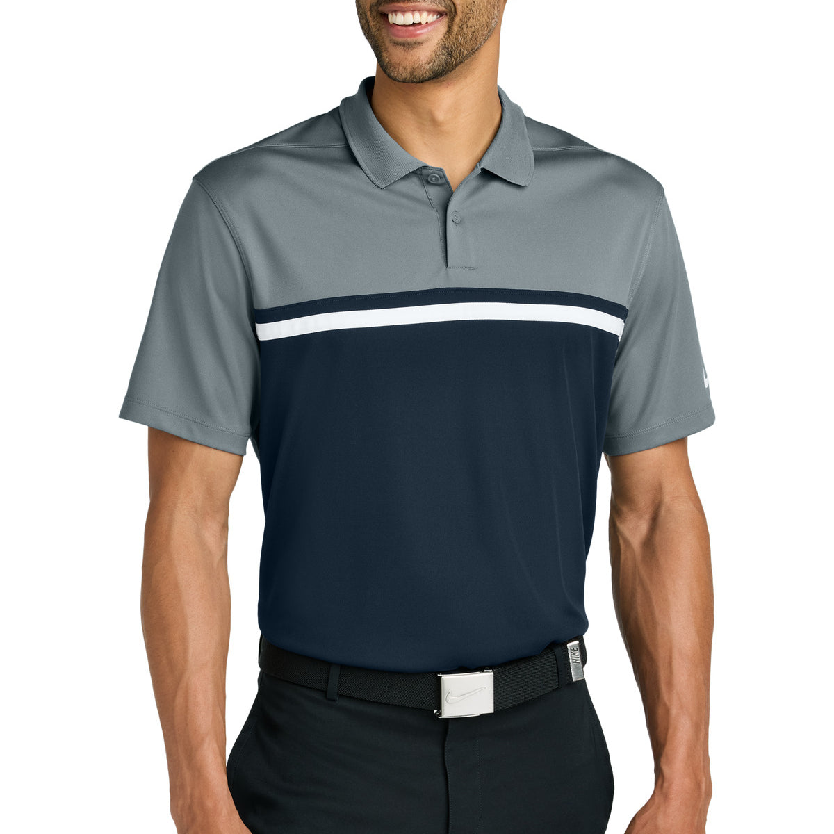 Built from at least 75% recycled polyester fabric, Nike scores a sustainable victory with this polo that stands out with colorblocking on the front and Dri-FIT moisture management technology. Details include an anti-curl flat knit collar, two-button placket with dyed-to-match buttons and rolled-forward shoulder seams for easy movement. A contrast heat transfer Swoosh logo is on the left sleeve. Made of 4-ounce, 100% polyester Dri-FIT fabric.
