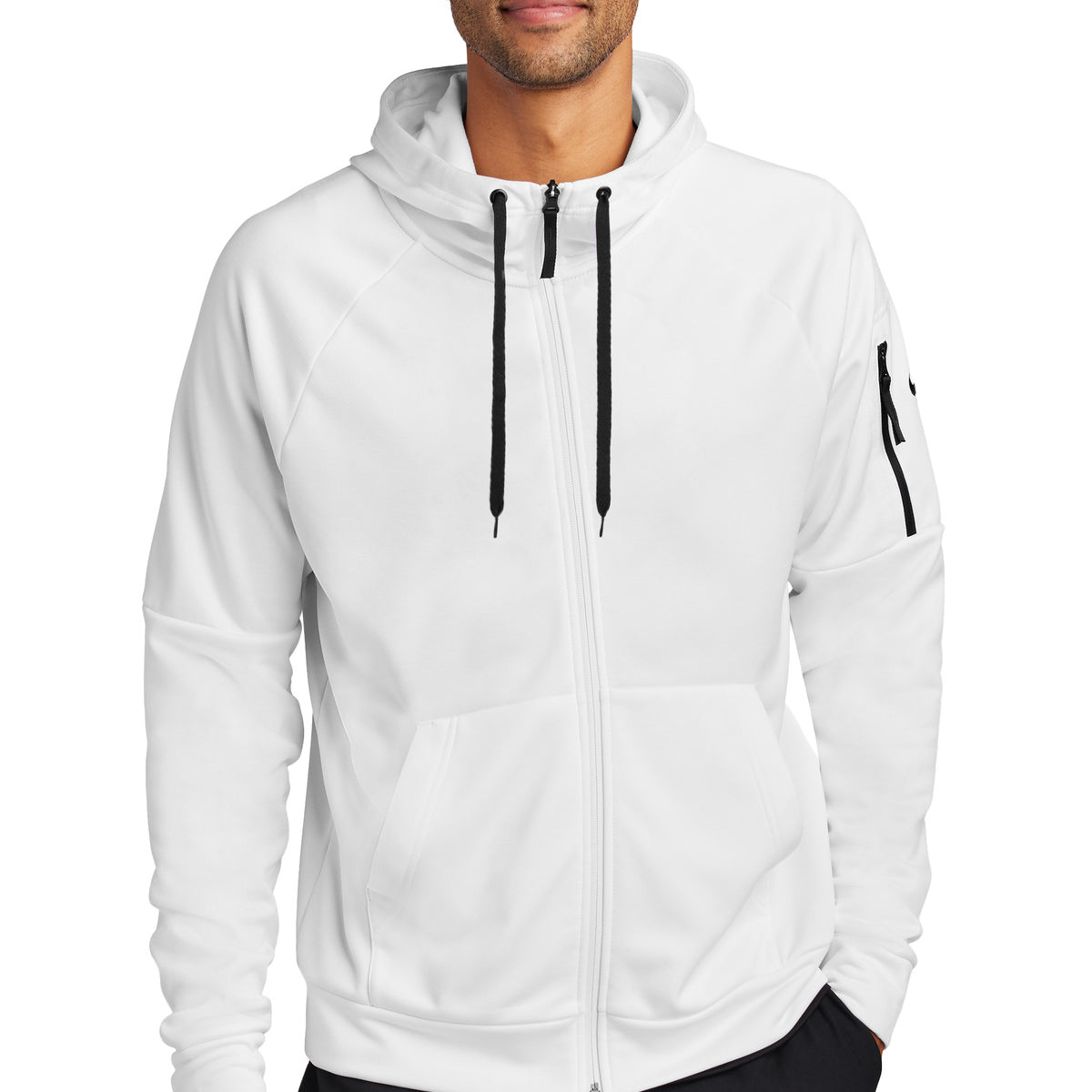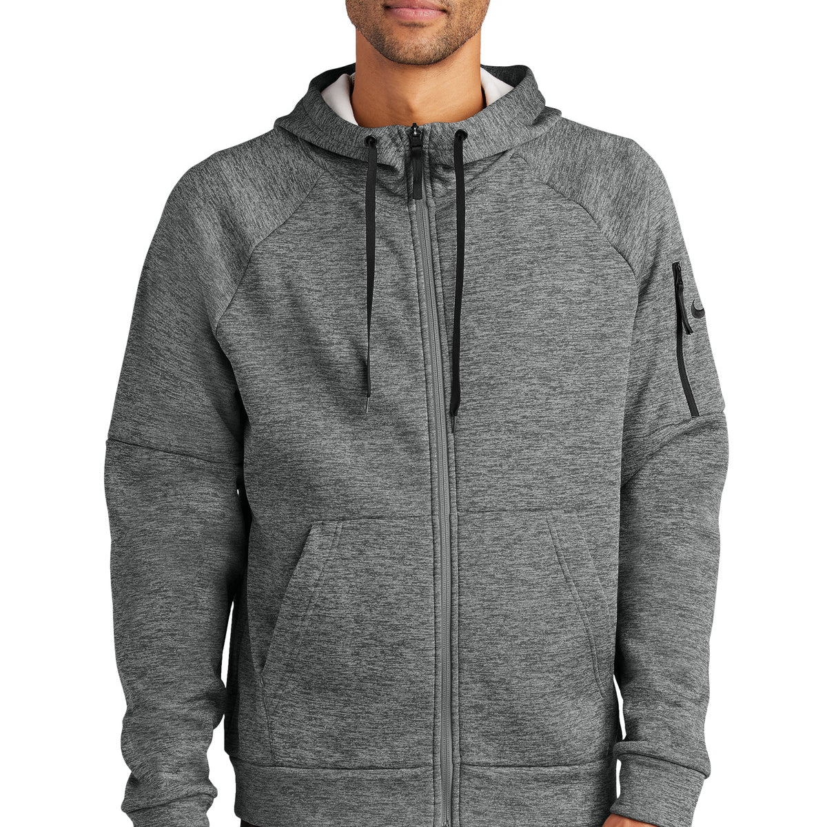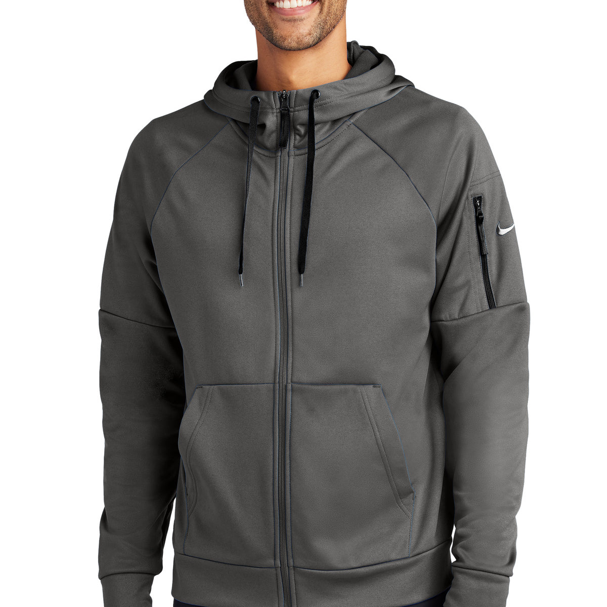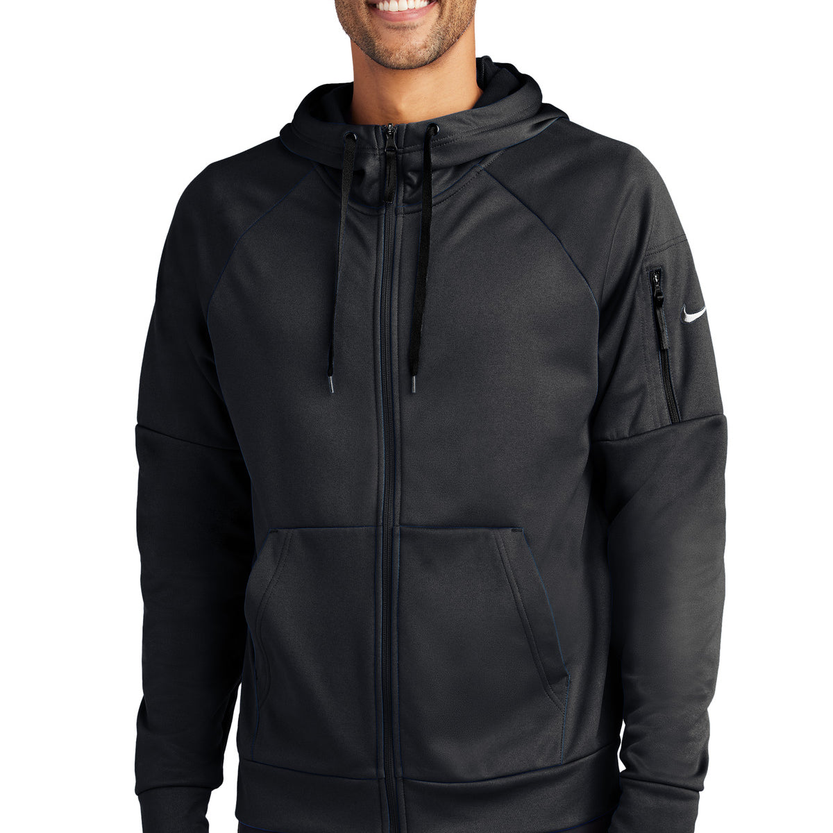 This full-zip hoodie with a zippered left arm pocket brings the heat to your workout with Therma-FIT fabric. Therma-FIT helps manage your body's natural heat to keep warm in cold-weather conditions. The design includes a three-panel hood with black drawcords, a dyed-to-match zipper and front pockets. Self-fabric cuffs and hem. A contrast Swoosh logo is embroidered on left sleeve. A contrast Therma-FIT logo is embroidered on back hem. Made of 7.4-ounce polyester Therma-FIT fabric with at least 50% recycled content.