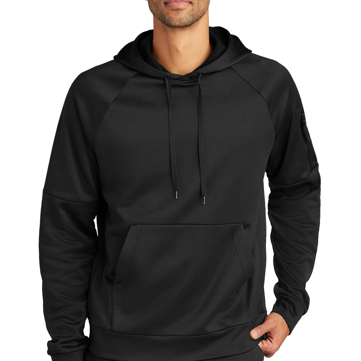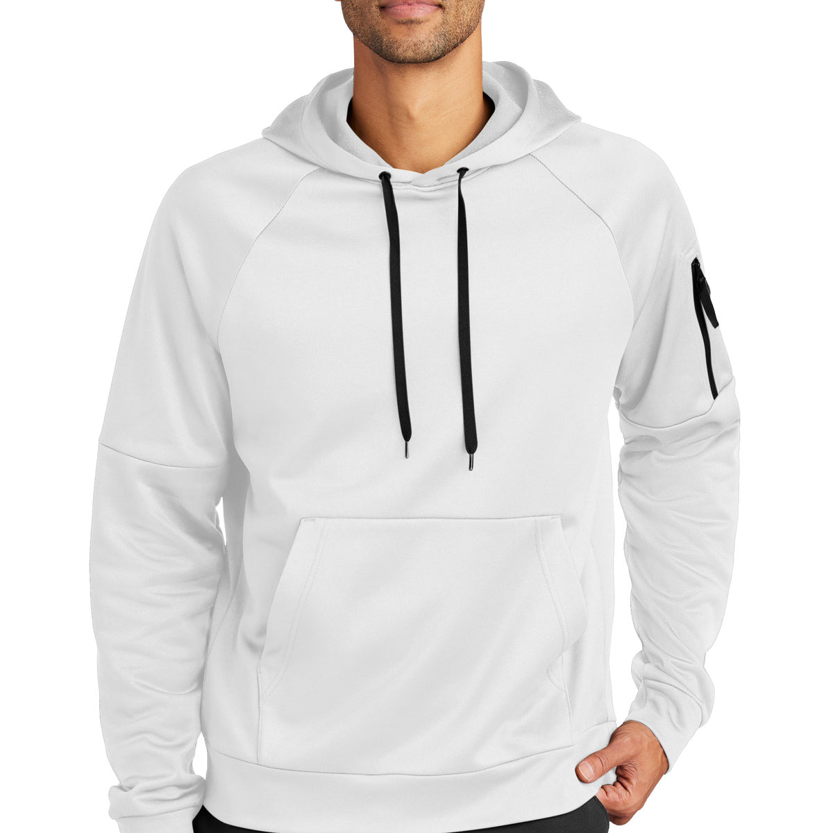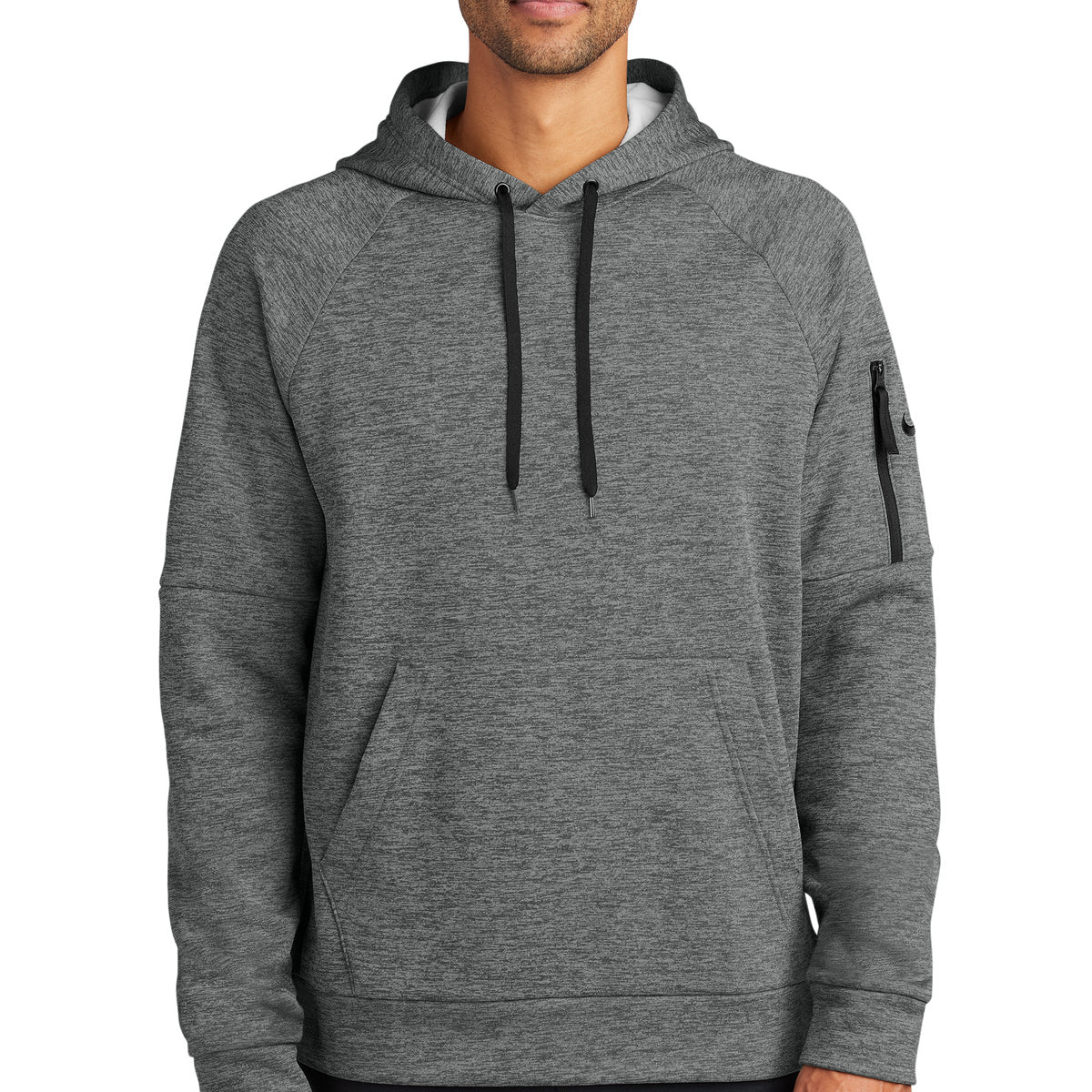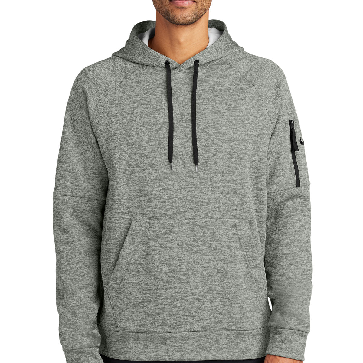 This hoodie with a zippered left arm pocket brings the heat to your workout with Therma-FIT fabric. Therma-FIT helps manage your body's natural heat to keep warm in cold-weather conditions. The design includes a three-panel hood with black drawcords and a front pouch pocket. Self-fabric cuffs and hem. A contrast Swoosh logo is embroidered on left sleeve. A contrast Therma-FIT logo is embroidered on back hem. Made of 7.4-ounce polyester Therma-FIT fabric with at least 50% recycled content.