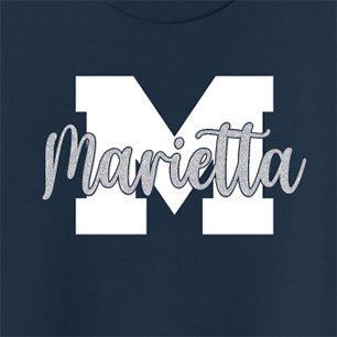 Special for the girls, Marietta in the script font is in glitter colors. On the navy shirt, the font color is silver and on the silver shirt the font color is sapphire!