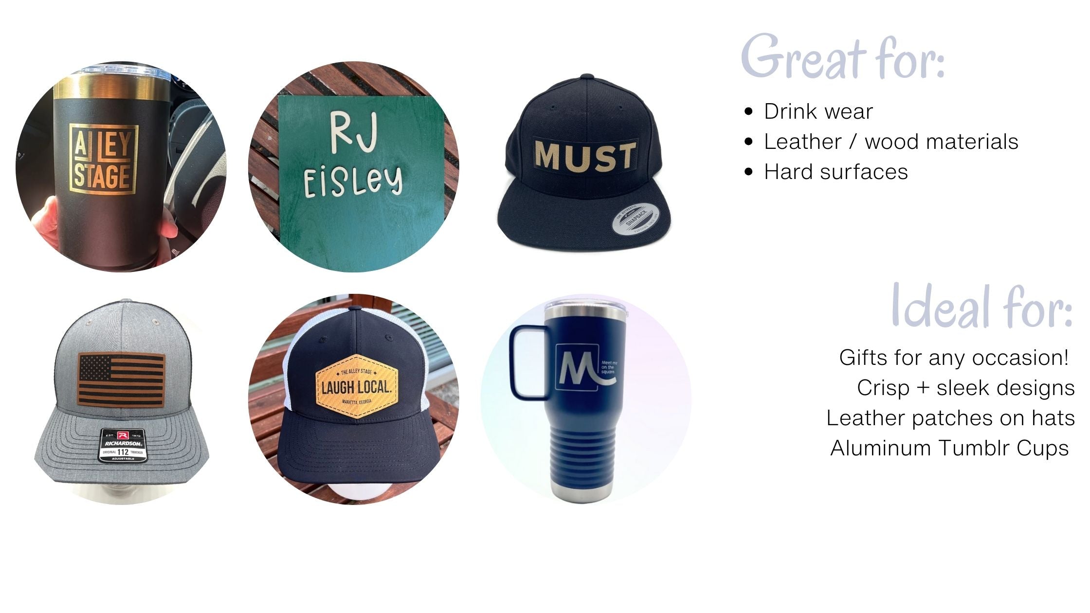 Precision, permanence, and a whole lot of polish—laser engraving is where your design gets the VIP treatment. Ideal for premium drinkware, leather patches, wood, metal, and other hard goods, this technique uses high-powered lasers to etch your design directly into the surface with ultra-fine detail.