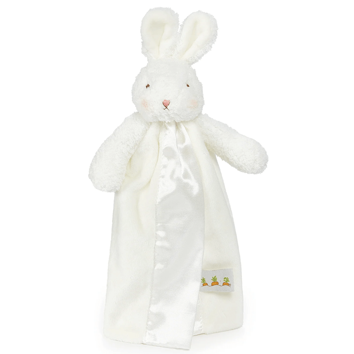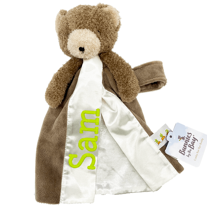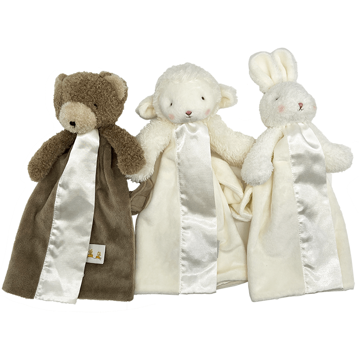 These precious lovies are ready to become your little one's new best friend! From our friends at Bunnies By The Bay, you can choose from a cuddly brown bear, sweet bunny, or a gentle lamb. These lovies have a handy velcro strap attached to their back, so you can easily attach them to a car seat, stroller, crib, or for your little one to hold! Your child's monogram will be added onto the satin edge with a color of your choice.