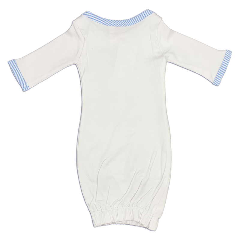 Prepare your newborn for memorable moments with our Blue Seersucker Trim Infant Gown. Crafted from soft, 100% knit jersey cotton, this gown features a stylish seersucker trim, perfect for their first trip home.