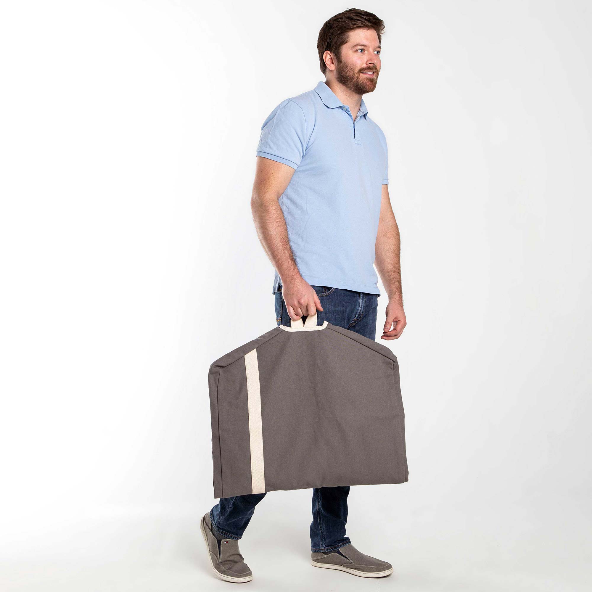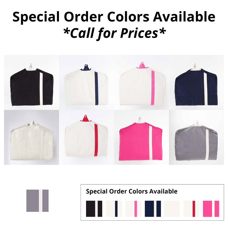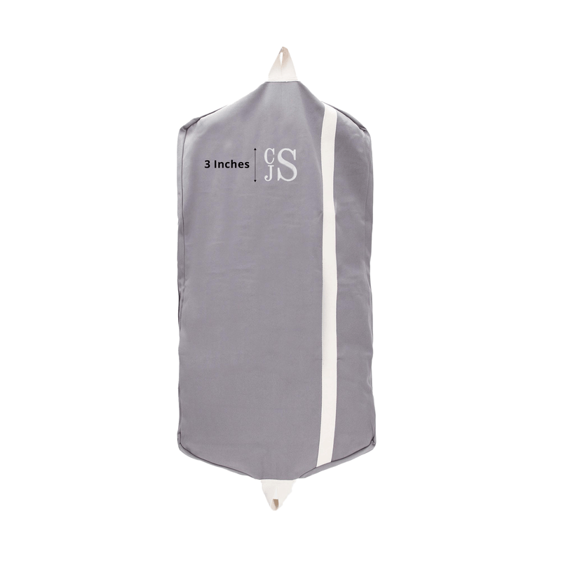 Protect your on-the-go wardrobe in style with this one of kind heavy duty canvas Garment Bag. Whether you're traveling with suits, dresses, or just clothes you don't want to fold and cram in your carry on, this sturdy accessory is a must have. Complete with two roomy inside zip pockets to house your smaller accessories and soft cotton web handles for comfortable carrying, we surely thought of everything with this one. Pick up this gray canvas body Garment Bag with natural front stripe and accents before your next trip.