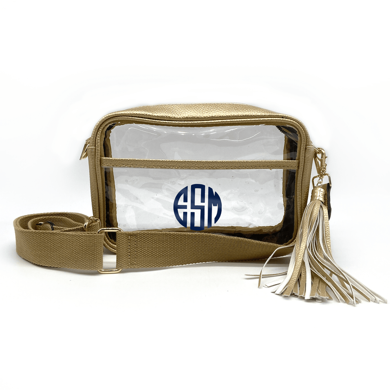 Our Game Day Ready stadium compliant crossbody zip bag! Featuring a clear PVC body with gold trim and gold metal accents. Comfortable and roomy, this bag is perfect for the Game Day girl who likes to come prepared!