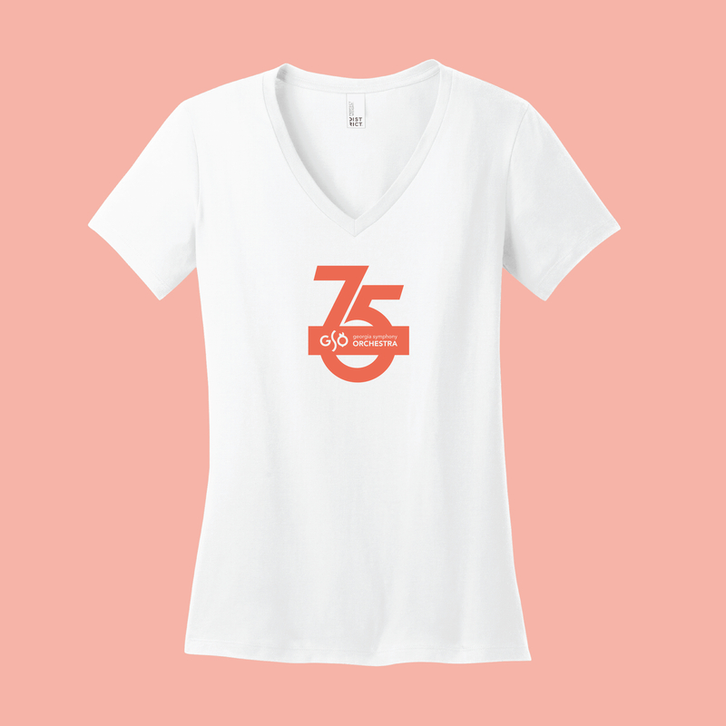 Celebrate the Georgia Symphony's 75th Anniversary in style with a limited edition tee! This ladies v-neck t-shirt features a 4.75" wide profesionally heat-applied vinyl 75th Anniversary Georgia Symphony design, perfect for commemorating your favorite orchestra!