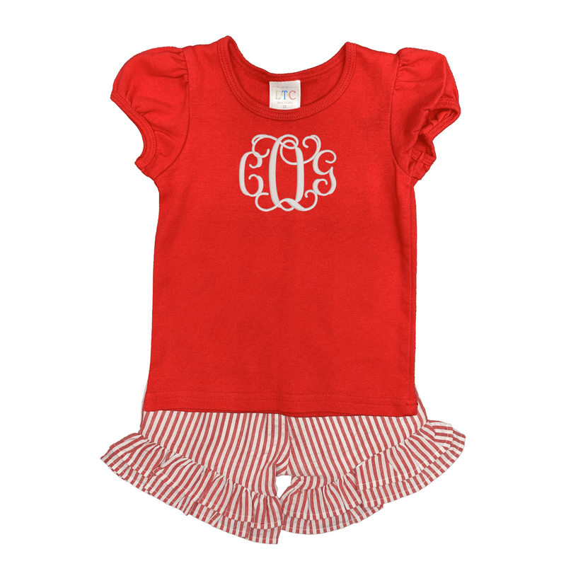 Red Puff Sleeve Tshirt and Stripe Seersucker Short Set