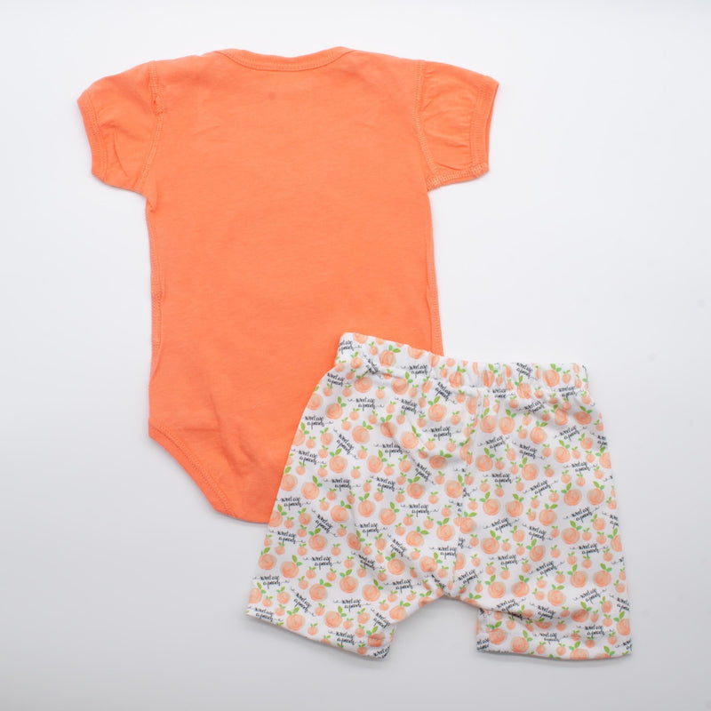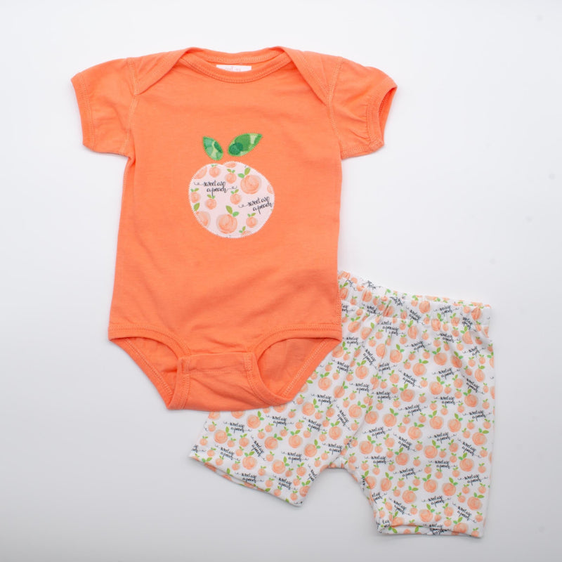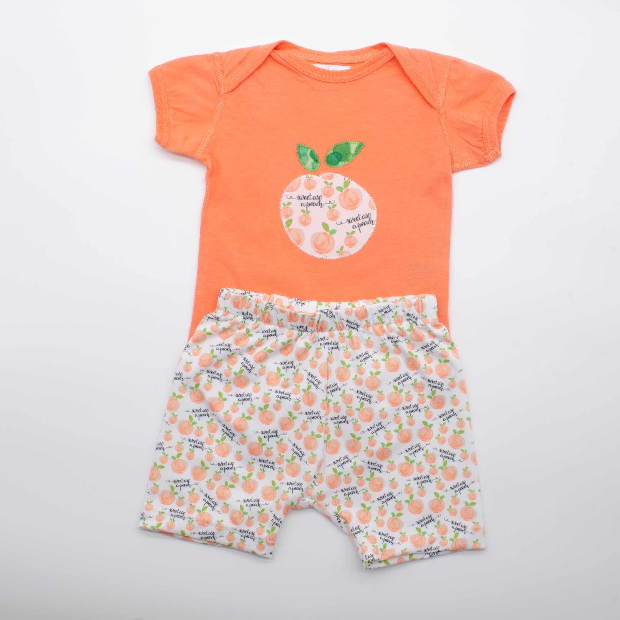 Our first collection for our Sweet as a Peach kid's brand is this clothing line for babies. This outfit features a onesie and a pair of matched shorts hand made by the Sew Dreams Come True team.