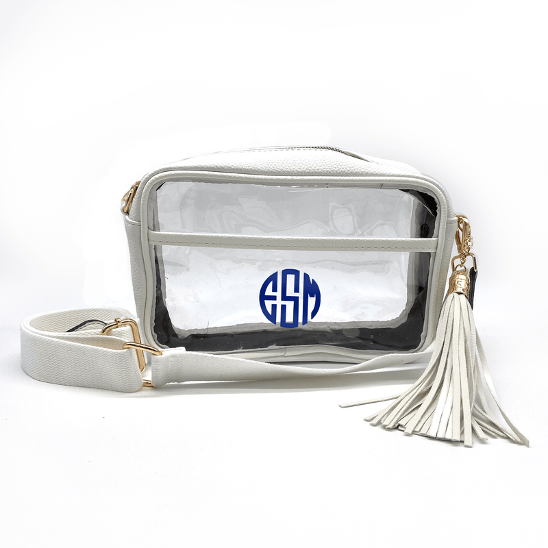 Our Game Day Ready stadium compliant crossbody zip bag! Featuring a clear PVC body with white vegan leather trim and gold metal accents. Comfortable and roomy, this bag is perfect for the Game Day girl who likes to come prepared!